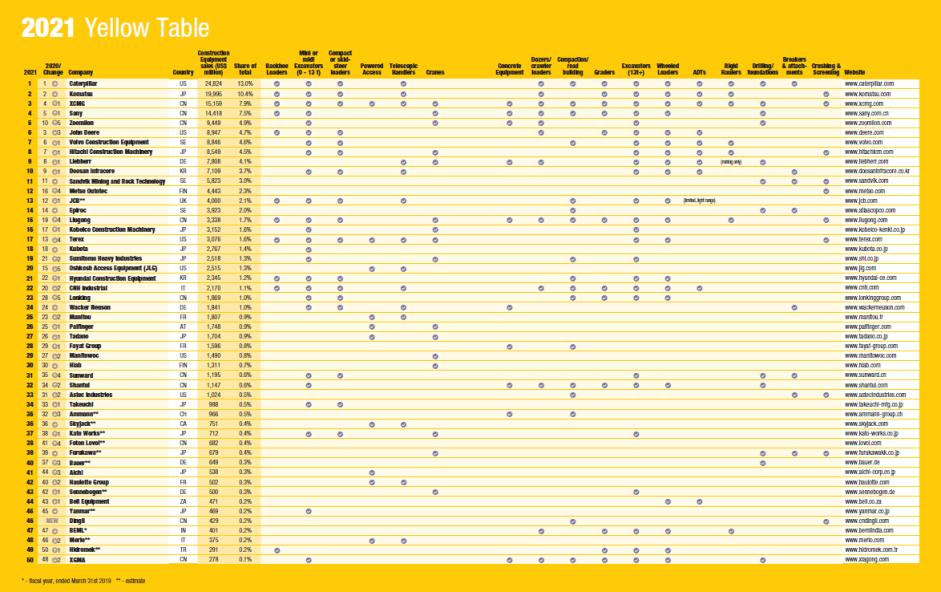 根據(jù)Off-highway Research的報告,中國工程機(jī)械銷售增長了大約14%,與此同時其它的主要市場均下滑。2020年中國的銷售超過全球市場的三分之一,毫無疑問本年度排行榜的顯著上升企業(yè)皆來自中國。在瀏覽這些數(shù)據(jù)之前,我們先看看排在最上面的耳熟能詳?shù)拿郑嚎ㄌ乇死铡?/p>