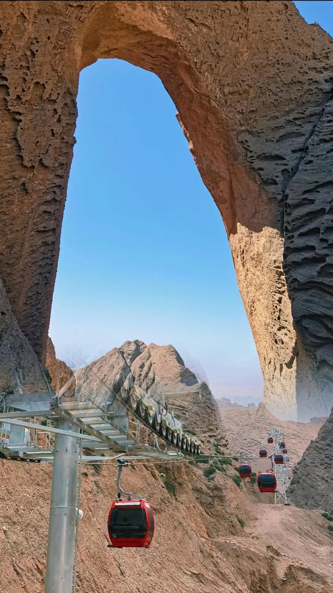 阿圖什天門位于新疆阿圖什市西天山南脈,是世界上最高的天然石拱門,高約500米,寬約100米,以其宏大的規模和獨特的地理位置而聞名。新疆阿圖什天門索道水平長765.911米,高差93米,沿線設立支架4座,全線30臺吊廂,最大運行速度6米/秒,每小時單向運量為2400人。為南疆第一條高山觀光索道。